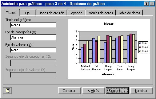 Una vez que el gráfico está en la hoja, lo podemos acomodar, y ademas podemos reeditarlo colocando el mouse sobre un elemento del gráfico, presionamos el botón derecho y seleccionamos alguna opción a editar para dicho elemento.