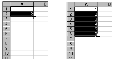 Las planillas electrónicas como Excel tienen la función de autocompletar que nos permite rellenar celdas en base a la información contenida en otras. Por ejemplo escribamos en la celda A1 el número 1, y en la celda A2 el número 2. Seleccionemos ambas celdas con el con el cursor del mouse y vamos hasta la esquina inferior derecha de la selección. Aparecerá una Cruz delgada, entonces presionamos el botón izquierdo del mouse y arrastramos hacia abajo, y veremos como apareceran los numeros 4, 5,6, etc. hasta que soltemos el mouse.